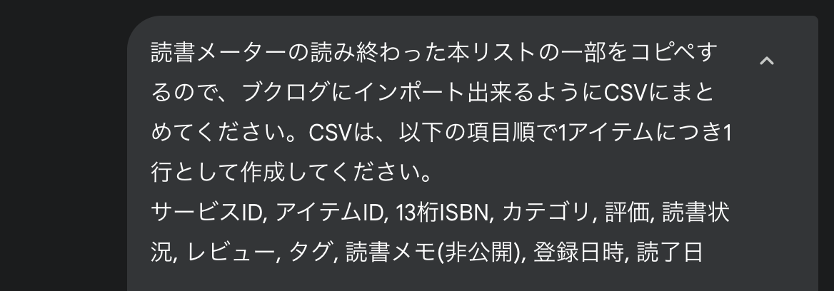 ブクログにはインポート機能があるので、そのフォーマットに従って必要な情報を抜き出してもらう。私が実際に使った雑プロンプトはこんな感じ。